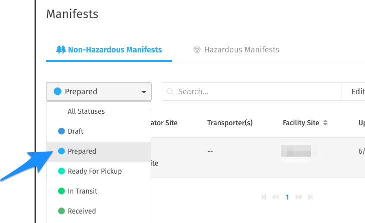 - If a Facility member or Service Provider created the Manifest for you to review and sign, they will Mark it as Prepared to indicate to you that it is ready for you to open and sign. You can filter your Manifest list view by the Prepared status to see these Manifests that are ready to sign.