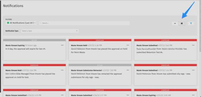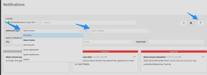 Notifications can be sorted by categories and subcategories. Select the filter button on the right-hand side of your screen, and a notification type drop-down appears. This drop-down lets you drill down your search by comments, waste streams, user accounts, service agreements, system notifications, and exports. Once selected, you can drill down your filter even further if needed.